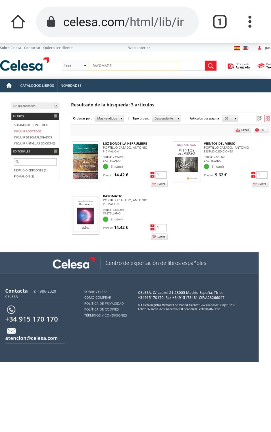 Adquirir mis libros en cualquier parte del mundo Publicado el 17 diciembre, 2020 por Antonio Portillo Casado Amigas y amigos de fuera de España este es el enlace que me pedís de la Distribuidora a la que tenéis que dirigiros para adquirir mis libros en cualquier librería del mundo: https://www.celesa.com/html/lib/index.php#https://www.celesa.com/html/lib/buscar/listaLibros.php?tipoBusqueda=R&tipoArticulo=&patron=PORTILLO%20CASADO%2CANTONIO&boton=Buscar& Compartir: Comparte en Facebook (Se abre en una ventana nueva) Facebook Compartir en X (Se abre en una ventana nueva) X Compartir en Tumblr (Se abre en una ventana nueva) Tumblr Haz clic en Pinterest (Se abre en una ventana nueva) Pinterest Compartir en Telegram (Se abre en una ventana nueva) Telegram Compartir en WhatsApp (Se abre en una ventana nueva) WhatsApp Compartir en LinkedIn (Se abre en una ventana nueva) LinkedIn Compartir en Reddit (Se abre en una ventana nueva) Reddit Compartir en Pocket (Se abre en una ventana nueva) Pocket Más Imprimir (Se abre en una ventana nueva) Imprimir Enviar un enlace a un amigo por correo electrónico (Se abre en una ventana nueva) Correo electrónico Me gusta Cargando... Relacionado