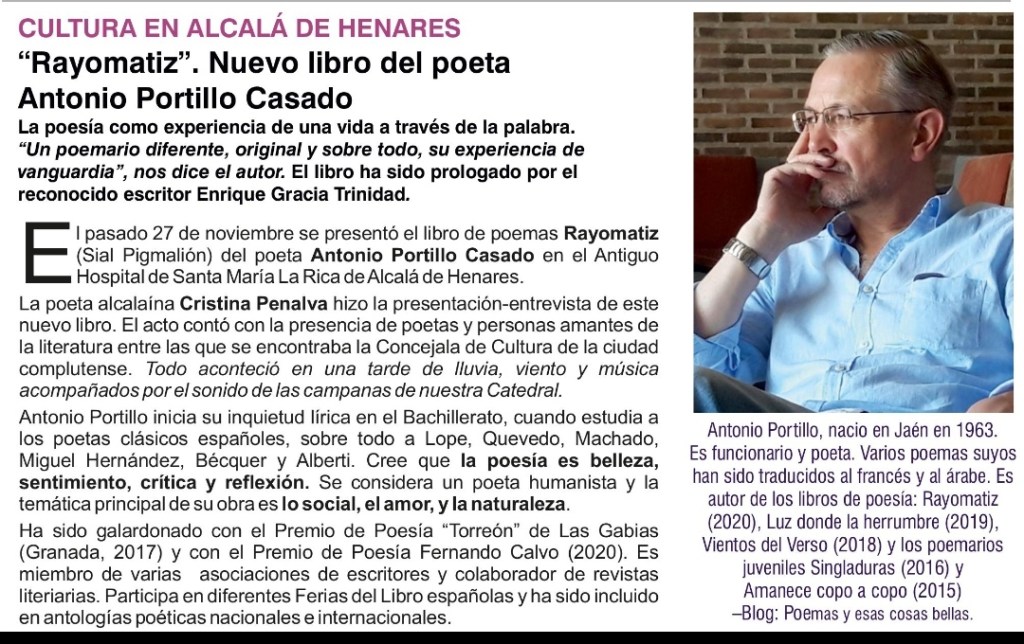 Reseña de Rayomatiz en La Crónica del Henares Publicado el 19 diciembre, 202019 diciembre, 2020 por Antonio Portillo Casado Mi agradecimiento al diario La Crónica del Henares por la reseña sobre la presentación de mi nuevo libro Rayomatiz el pasado 27 de noviembre en Alcalá de Henares. Compartir: Comparte en Facebook (Se abre en una ventana nueva) Facebook Compartir en X (Se abre en una ventana nueva) X Compartir en Tumblr (Se abre en una ventana nueva) Tumblr Haz clic en Pinterest (Se abre en una ventana nueva) Pinterest Compartir en Telegram (Se abre en una ventana nueva) Telegram Compartir en WhatsApp (Se abre en una ventana nueva) WhatsApp Compartir en LinkedIn (Se abre en una ventana nueva) LinkedIn Compartir en Reddit (Se abre en una ventana nueva) Reddit Compartir en Pocket (Se abre en una ventana nueva) Pocket Más Imprimir (Se abre en una ventana nueva) Imprimir Enviar un enlace a un amigo por correo electrónico (Se abre en una ventana nueva) Correo electrónico Me gusta Cargando... Relacionado
