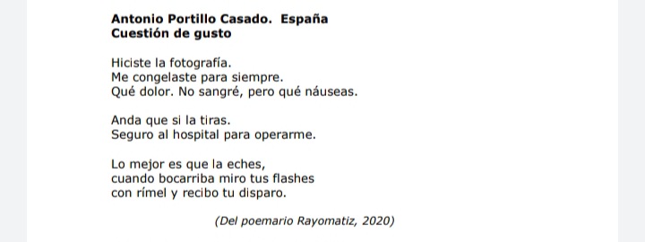 Cuestión de gusto. Poema de Antonio Portillo Casado publicado en la revista poética Oriflama Publicado el 9 junio, 20219 junio, 2021 por Antonio Portillo Casado Mi agradecimiento a la poeta Isabel Díez Serrano por publicar mi poema «Cuestión de gusto» en la estupenda revista poetica que dirige, Oriflama. Compartir: Comparte en Facebook (Se abre en una ventana nueva) Facebook Compartir en X (Se abre en una ventana nueva) X Compartir en Tumblr (Se abre en una ventana nueva) Tumblr Haz clic en Pinterest (Se abre en una ventana nueva) Pinterest Compartir en Telegram (Se abre en una ventana nueva) Telegram Compartir en WhatsApp (Se abre en una ventana nueva) WhatsApp Compartir en LinkedIn (Se abre en una ventana nueva) LinkedIn Compartir en Reddit (Se abre en una ventana nueva) Reddit Compartir en Pocket (Se abre en una ventana nueva) Pocket Más Imprimir (Se abre en una ventana nueva) Imprimir Enviar un enlace a un amigo por correo electrónico (Se abre en una ventana nueva) Correo electrónico Me gusta Cargando... Relacionado
