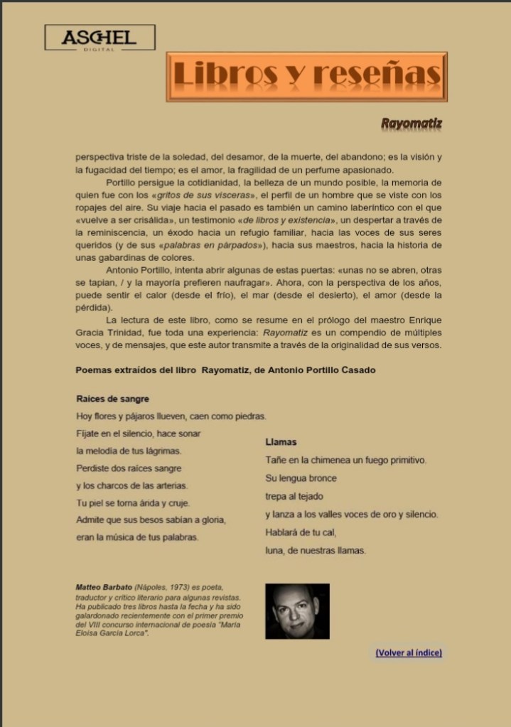 Entrevista al Poeta Antonio Portillo Casado Con Motivo de la Publicación de Rayomatiz POR ANA PATRICIA SANTAELLA A.P- Ha publicado hace unos meses Rayomatiz, un poemario editado por Sial Pigmalión. En la reseña aparecida en la magnífica revista literaria ASCHEL, por el poeta italiano Matteo Barbato, dice: “Rayomatiz es una miscelánea, un cúmulo de […]