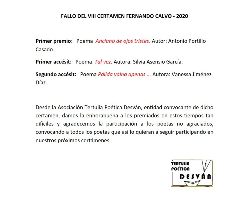 Comparto con vosotros una estupenda noticia, he ganado el Premio de Poesía del VIII CERTAMEN DE POESÍA FERNANDO CALVO GARCÍA convocado por la Asociación Tertulia Poética El Desván.